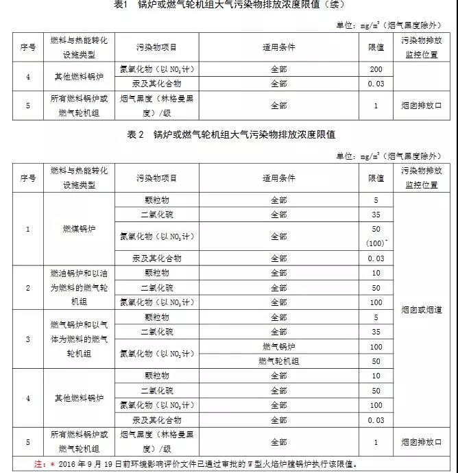 4.22016年9月20日起至本標準實施之日前環境影響評價文件通過審批的燃煤鍋爐,2017年1月1日起至本標準實施之日前環境影響評價文件通過審批的燃油鍋爐和以油為燃料的燃氣輪機組、燃氣鍋爐和以氣體為燃料的燃氣輪機組以及其他燃料鍋爐,新建鍋爐或燃氣輪機組,自本標準實施之日起執行表2中的排放濃度限值。