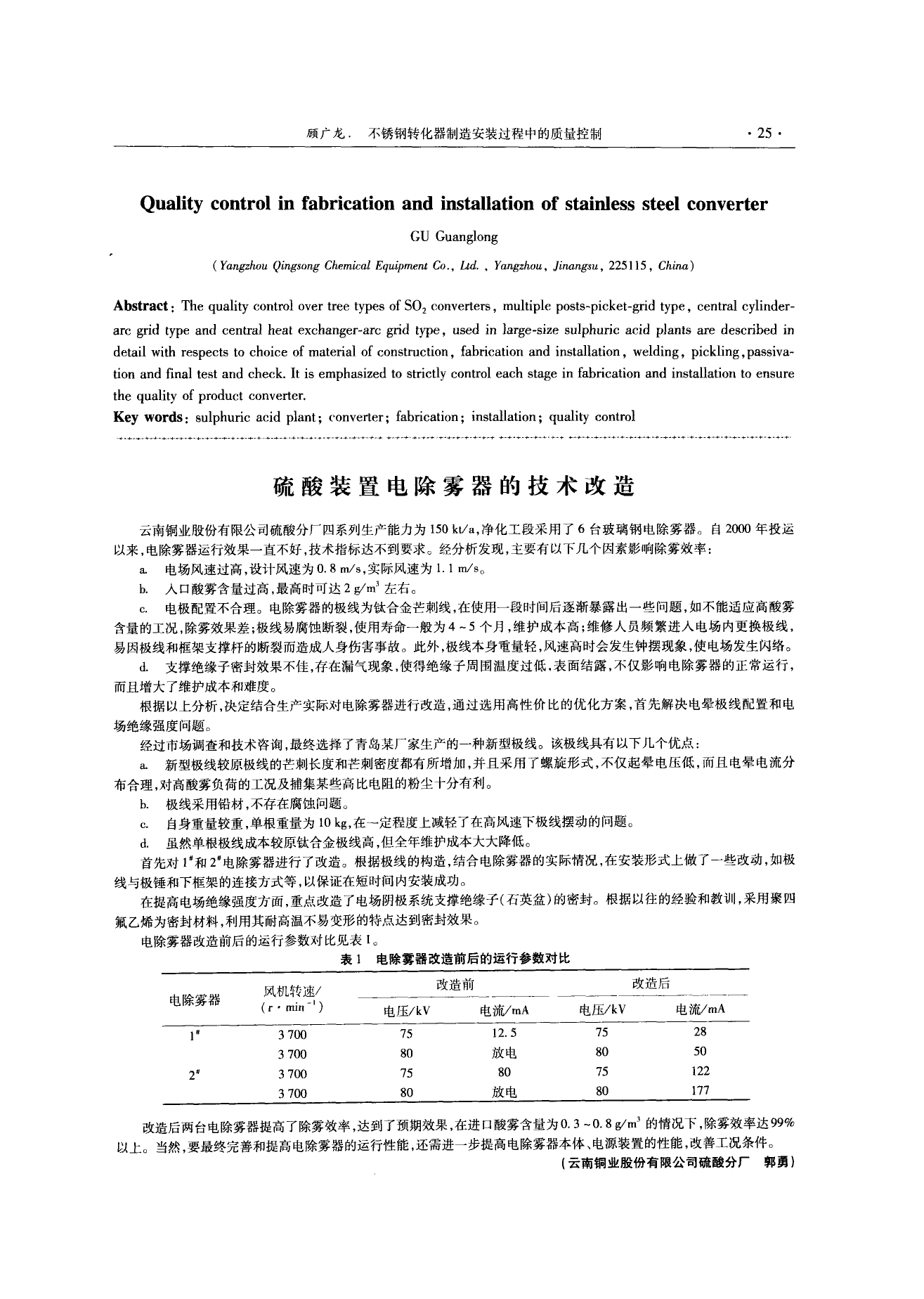 河北威美環(huán)保專注于煙氣污染深度治理領(lǐng)域,致力于濕式靜電除塵器、電除霧器及脫硫脫硝等煙氣處理領(lǐng)域環(huán)保工程技術(shù)咨詢、設(shè)計、制作、安裝及維護(hù)等相關(guān)技術(shù)服務(wù),濕電相關(guān)技術(shù)探討咨詢張工18633235200,以下這篇論文詳述了“硫酸裝置電除霧器的技術(shù)改造”,現(xiàn)轉(zhuǎn)發(fā)給大家參考: