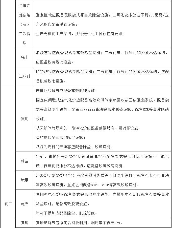 暫未制訂行業排放標準的工業爐窯,包括鑄造,日用玻璃,玻璃纖維、耐火材料、石灰、礦物棉等建材行業,鎢、工業硅、金屬冶煉廢渣(灰)二次提取等有色金屬行業,氮肥、電石、無機磷、活性炭等化工行業,應參照相關行業已出臺的標準,全面加大污染治理力度(見附件4),鑄造行業燒結、高爐工序污染排放控制按照鋼鐵行業相關標準要求執行;重點區域原則上按照顆粒物、二氧化硫、氮氧化物排放限值分別不高于30、200、300毫克/立方米實施改造,其中,日用玻璃、玻璃棉氮氧化物排放限值不高于400毫克/立方米;已制定更嚴格地方排放標準的地區,執行地方排放標準。